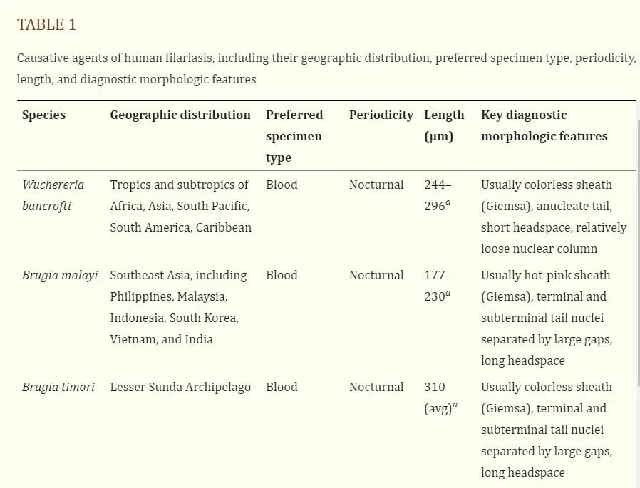 Wuchereria bancrofti memiliki ukuran mikrofilaria yang lebih besar dibandingkan dengan Brugia malayi dan Brugia timori.