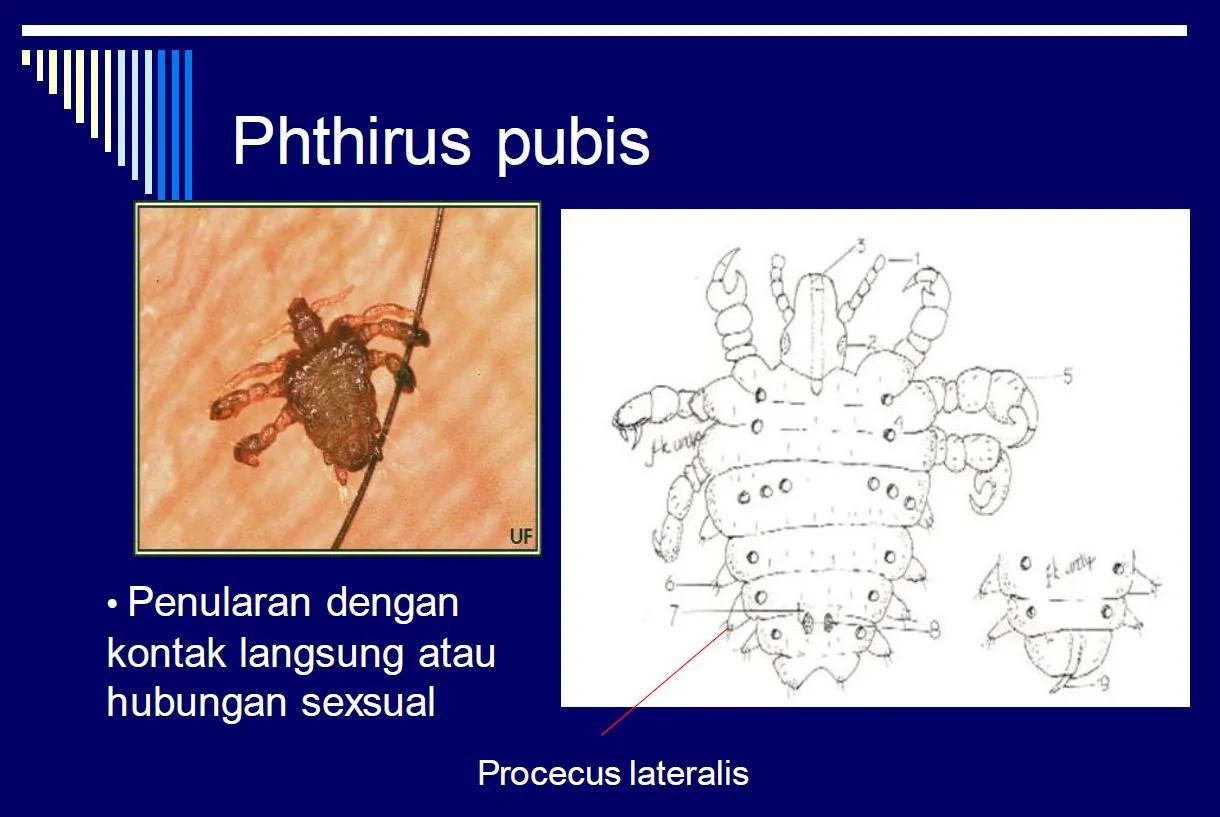 Manifestasi Klinis: Pruritus pada area pubis, papula eritematosa, dan kutu yang terlihat pada rambut pubis. Pada beberapa kasus, dapat ditemukan macula berwarna biru-abu-abu (macula cerulea).